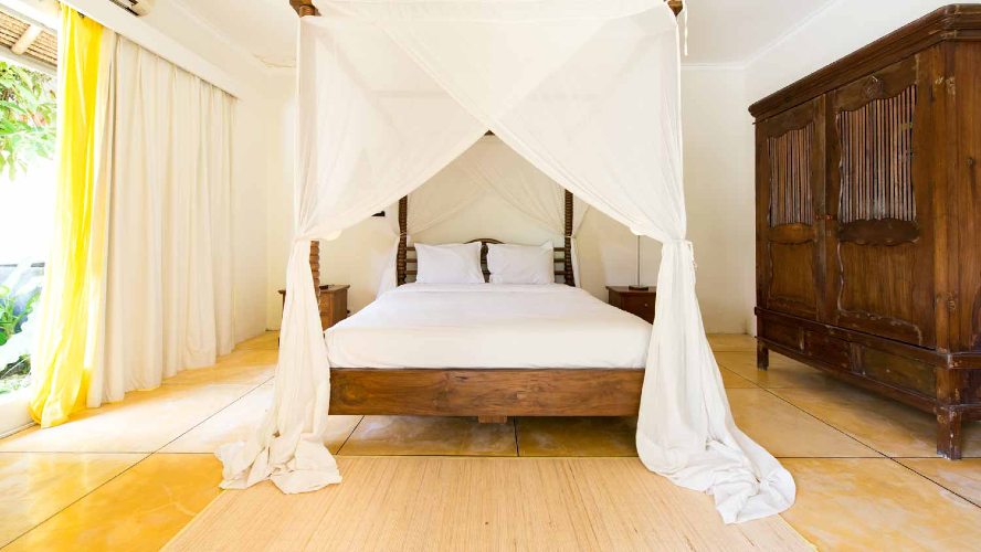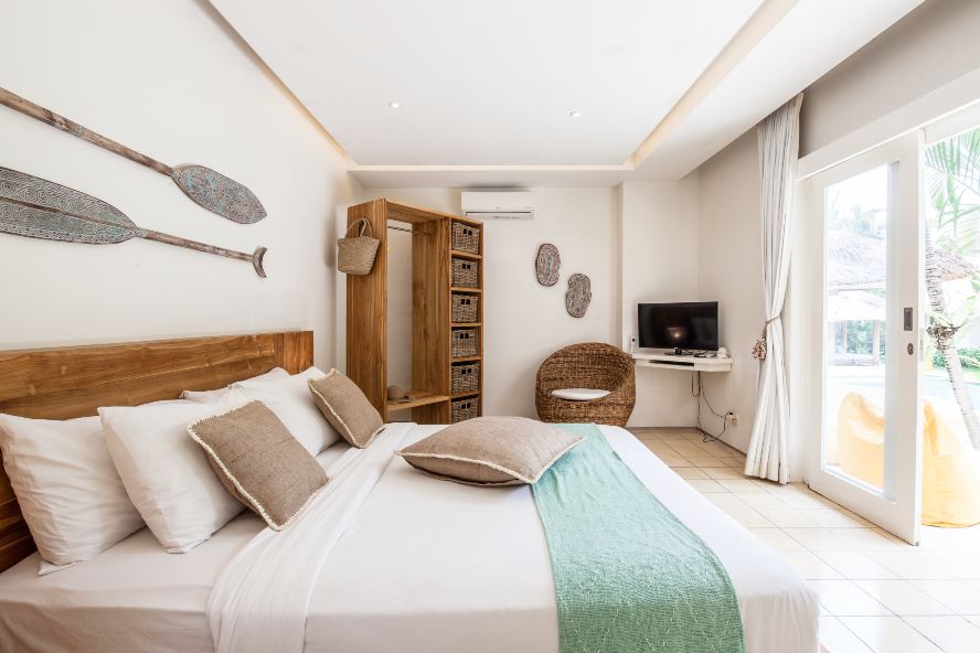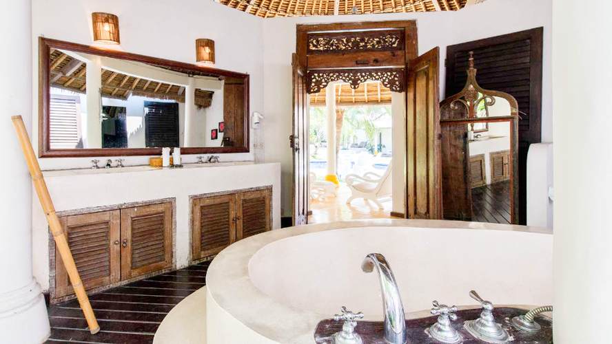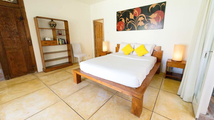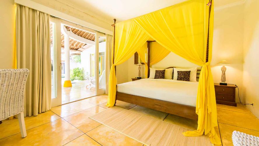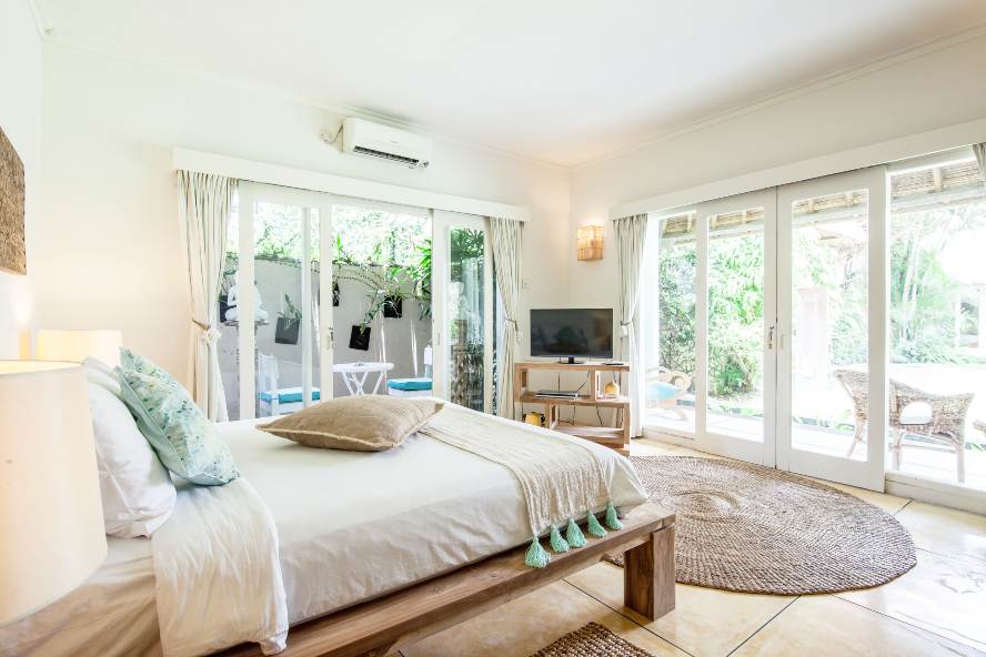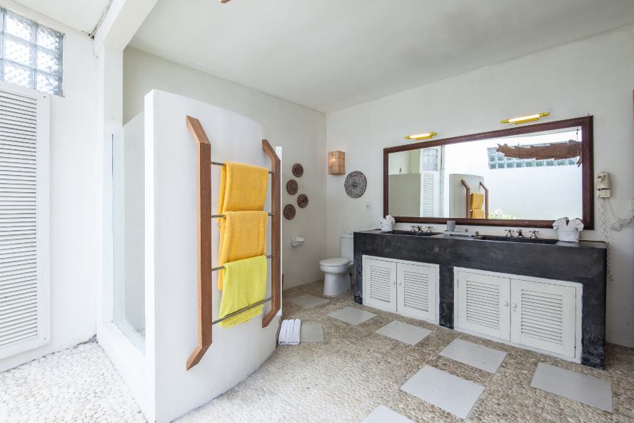 This villa houses 3 master rooms with private bathrooms, and one bungalow with two bedrooms separated by a bathroom with a bath and shower. Each room has Air conditioning and a TV.